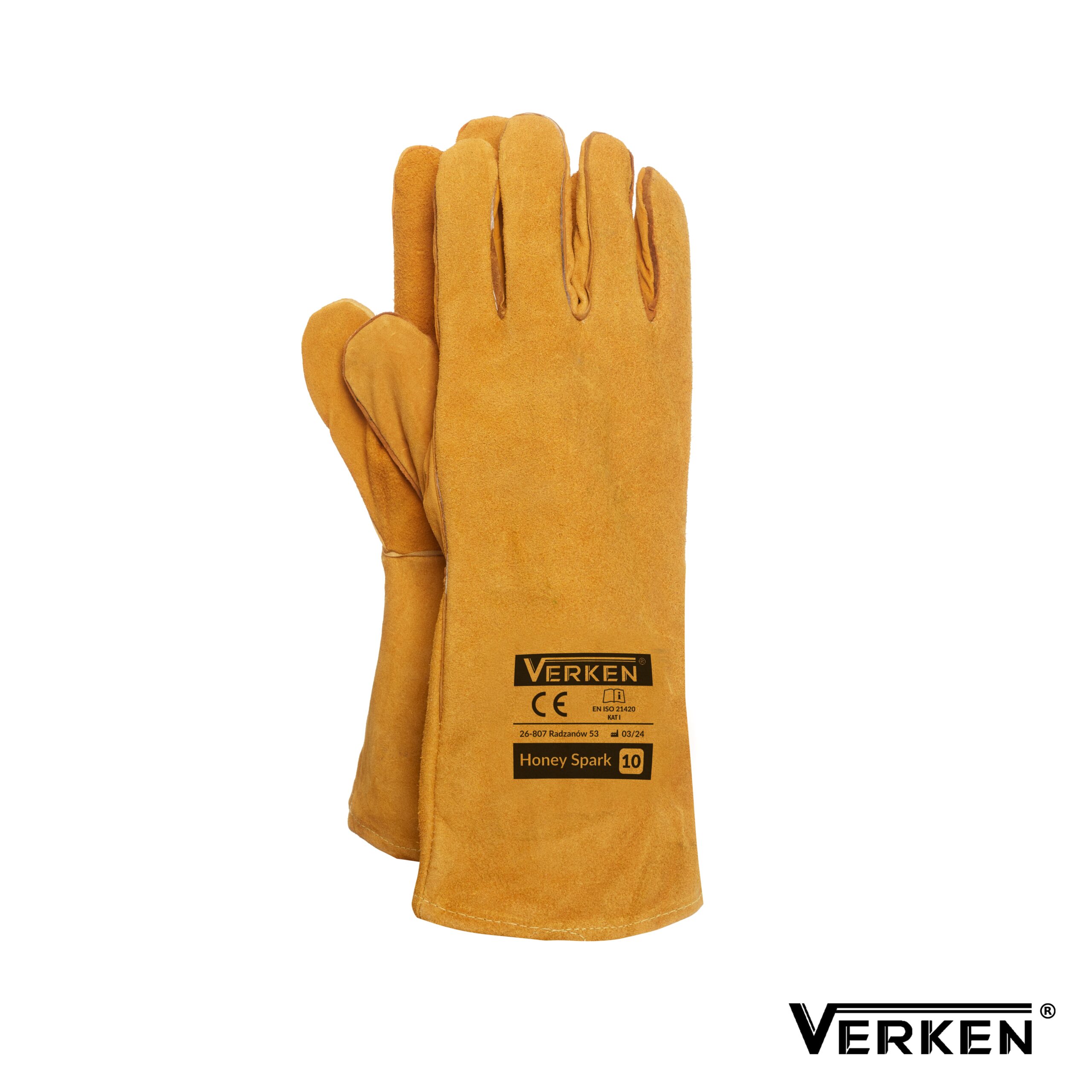 Rękawice ochronne VERKEN Honey Spark to wysokiej jakości rękawice spawalnicze wykonane w całości z dwoiny bydlęcej. Dzięki zastosowaniu nici kevlarowych rękawice cechują się zwiększoną odpornością na wysoką temperaturę oraz uszkodzenia mechaniczne